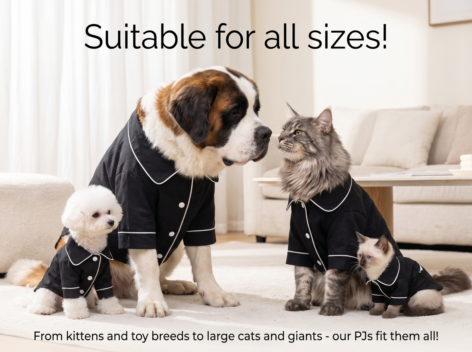 No more worrying about size. Our pajamas are designed to fit all pets — from tiny kittens to large dogs — with comfort, flexibility, and style.